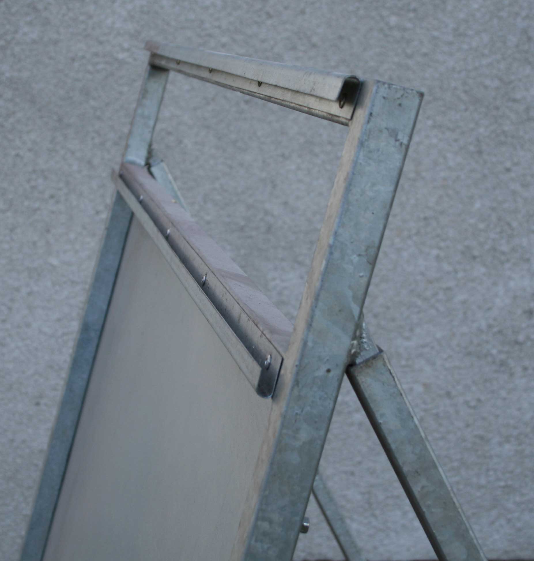 Konstrukcje stanowią spawane profile zamknięte do których od tyłu przykręcona jest blacha stalowa ocynkowana grubości 0,8 mm. Zastrzał to profile zespawane w kształt litery H. Dzięki przemyślanej a zarazem prostej budowie ekspozytora można z powodzeniem łączyć go w paczki po dziesięć sztuk, co ułatwia transport i pozwala na korzystanie z wózków widłowych podczas rozładunku. Stojak wyposażony jest w szyny do mocowania szyldów reklamowych o wymiarach 15 na 100 cm. Powierzchnia przeznaczona na ekspozycje bruku to 102 na 102 cm.