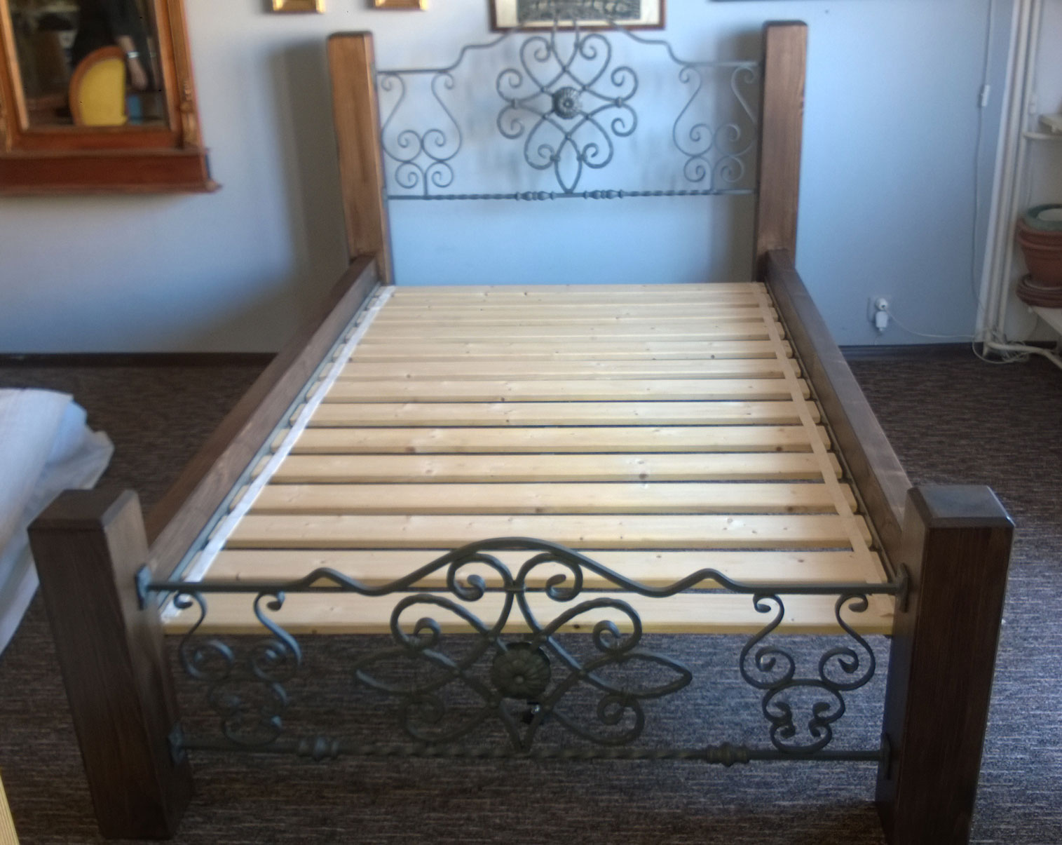 • Stylowe, łóżka drewniano-metalowe wykonane z belek sosnowych o przekroju 15×15 cm. Konstrukcja drewniana jest łączona i klejona na wpusty w starym stylu. Pospawane, kute metalowe elementy tworzą ażurowy wzór. Piaskowanie metalu zapewnia jego jednolitą strukturę, a zabezpieczenie lakierem sprawia, że całość staje się odporna na korozję.