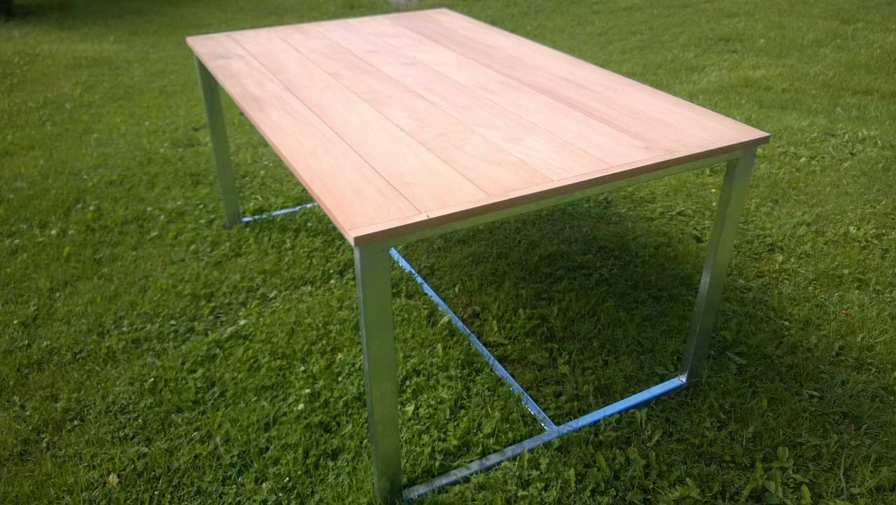 Meble ogrodowe o konstrukcji stalowej, ocynkowanej ogniowo. Blat stołu wykonany z desek drewna egzotycznego grubości 20 mm. Na uwagę zasługuje wykończenie krótszych boków stołu, dające pożądany efekt wizualny.