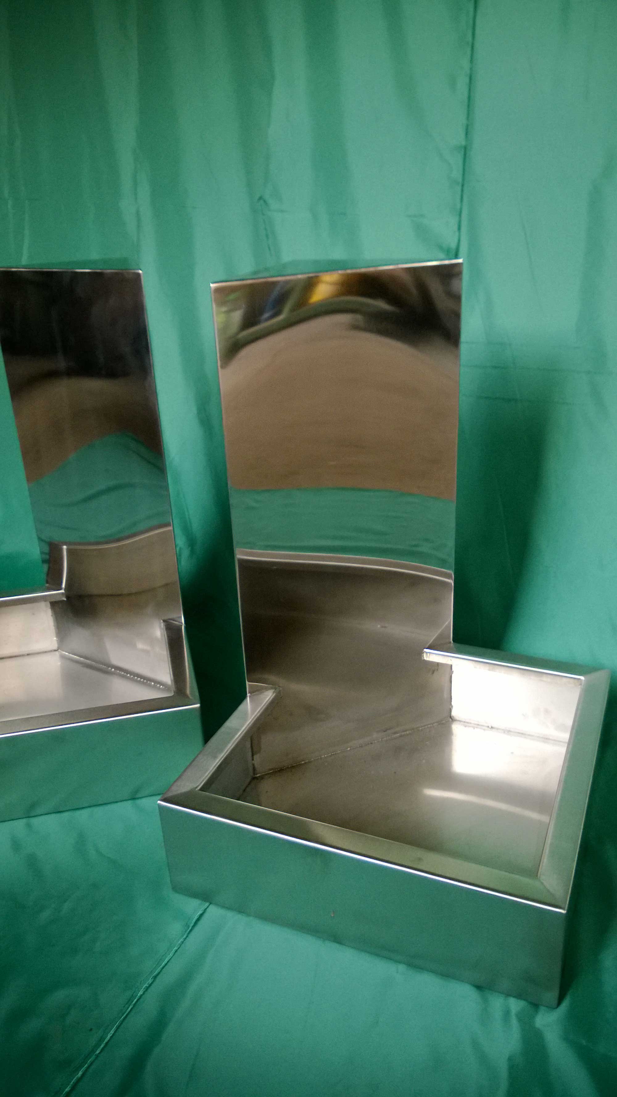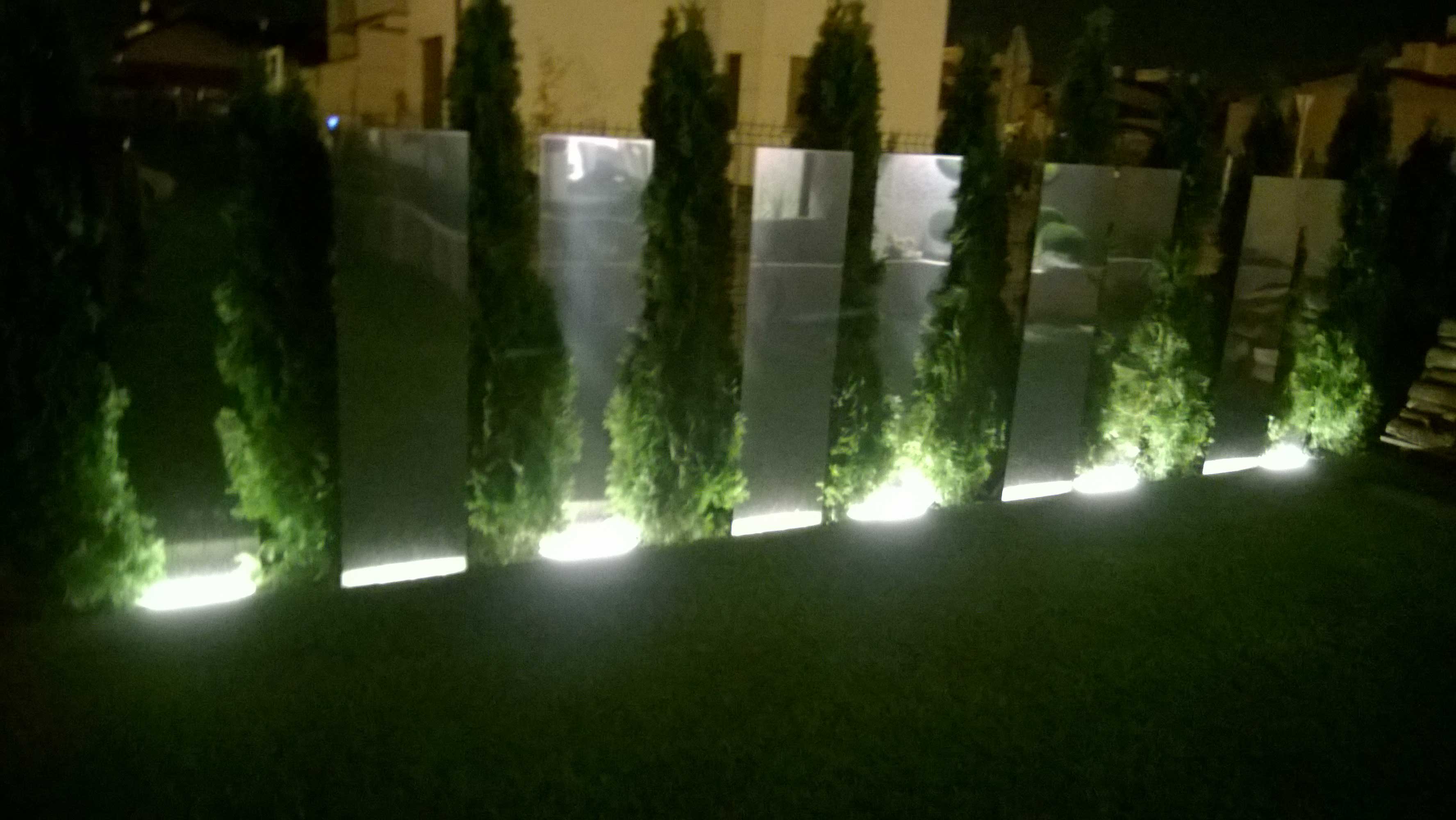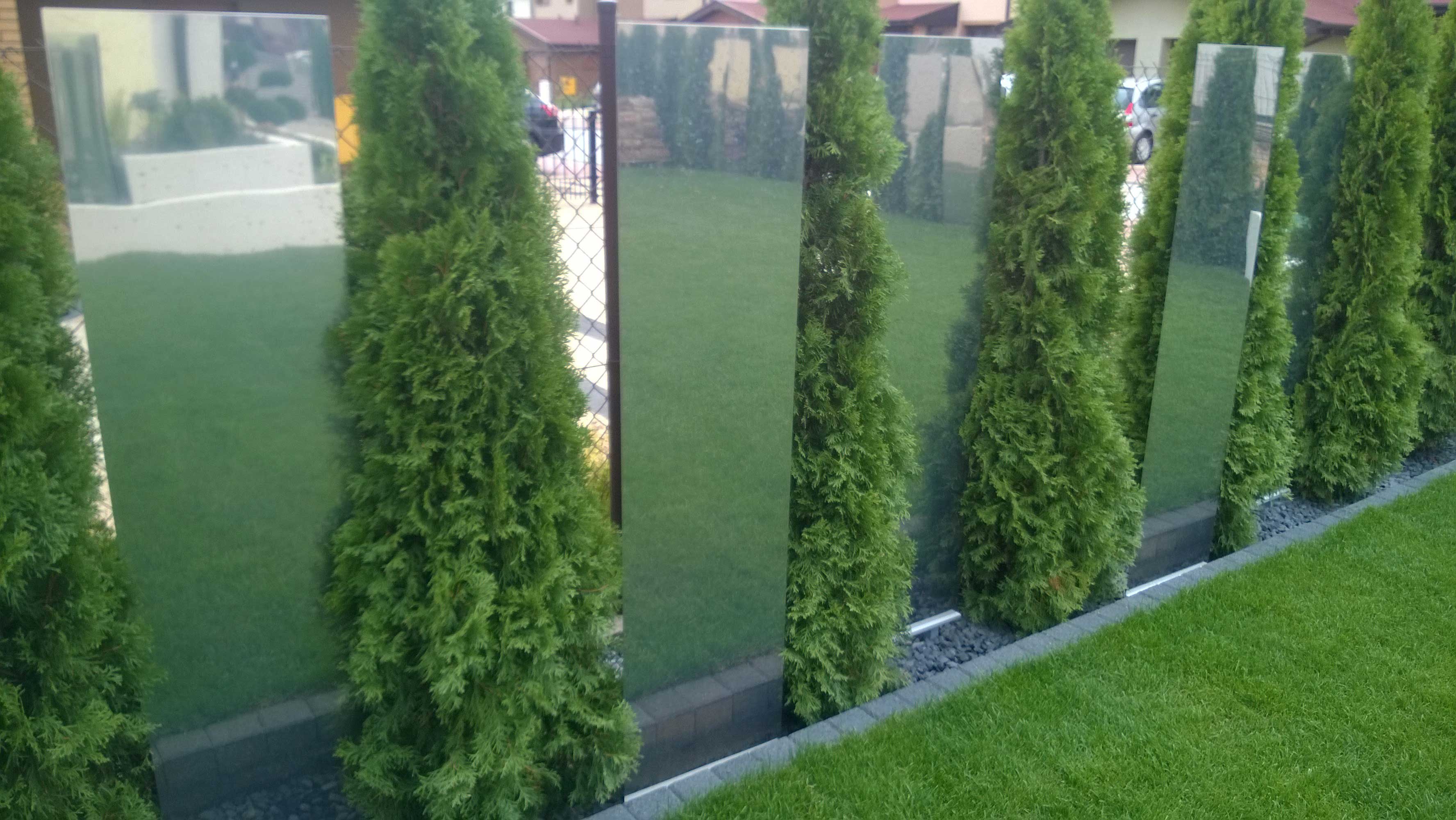 W lustrach odbija się piękno ogrodu. Prezentowane lustra zrobione są z wypolerowanej blachy nierdzewnej, przymocowanej do metalowych stelaży, osadzonych na bloczkach betonowych. Podświetlenie stanowią diody LED.