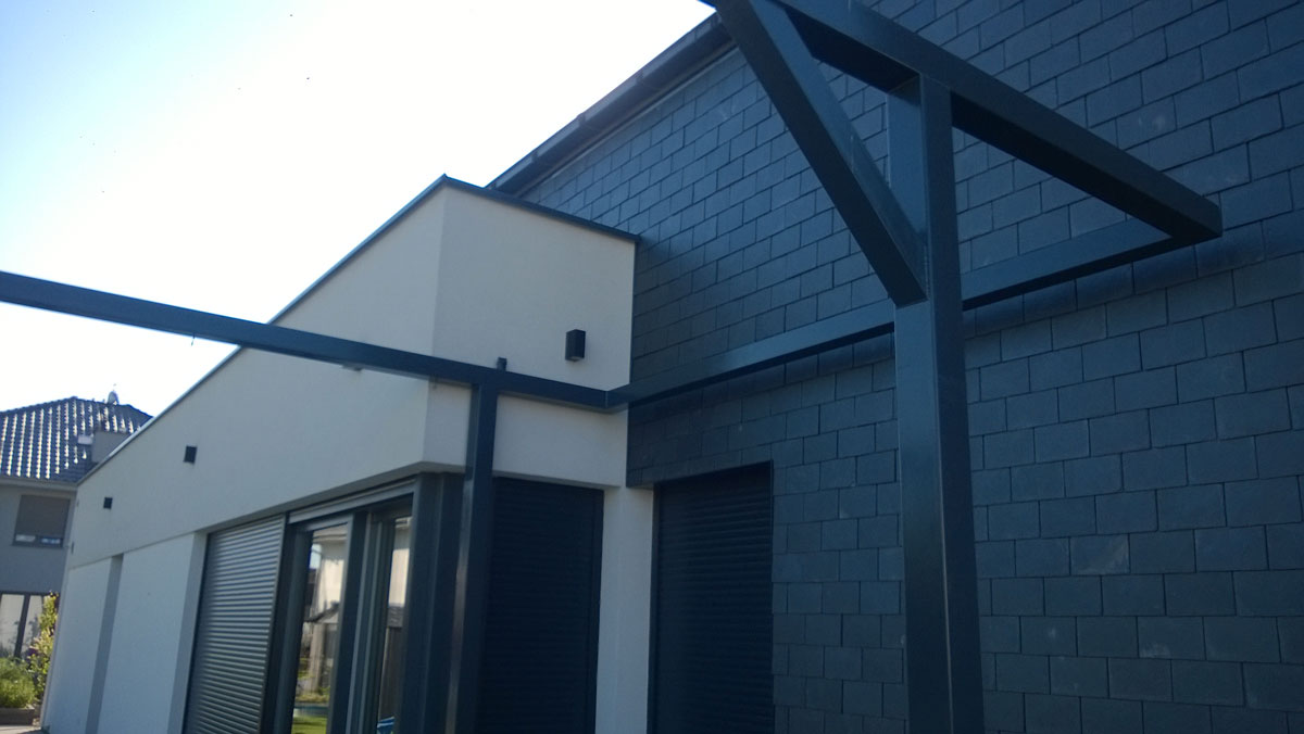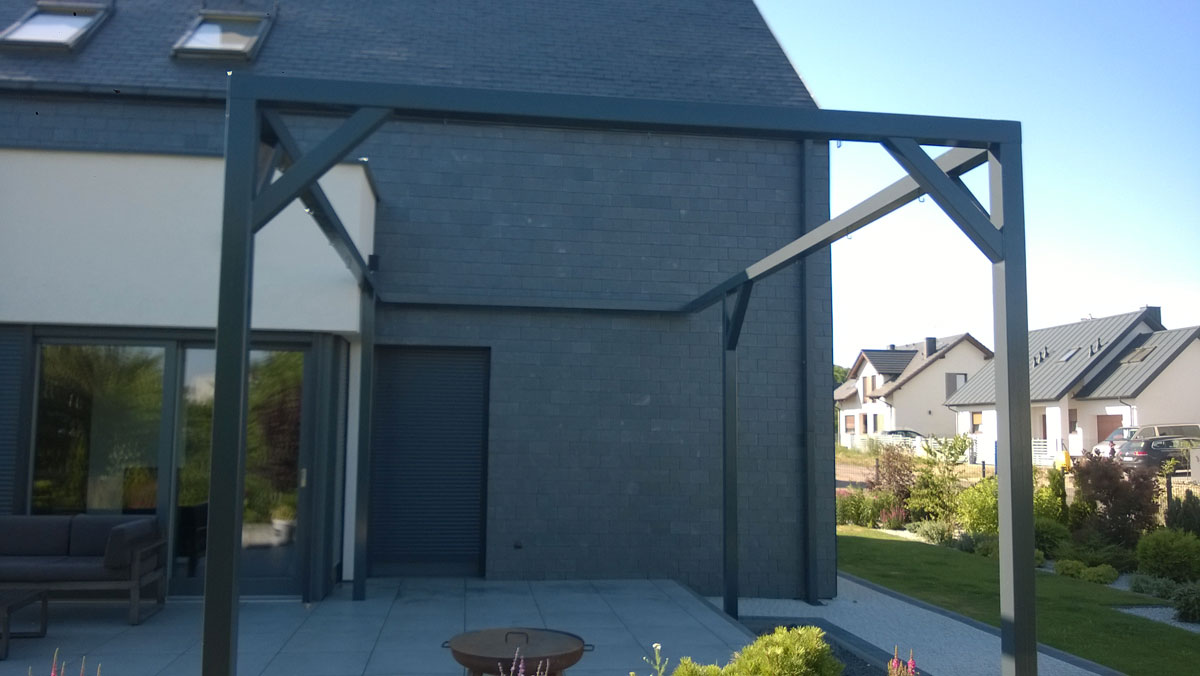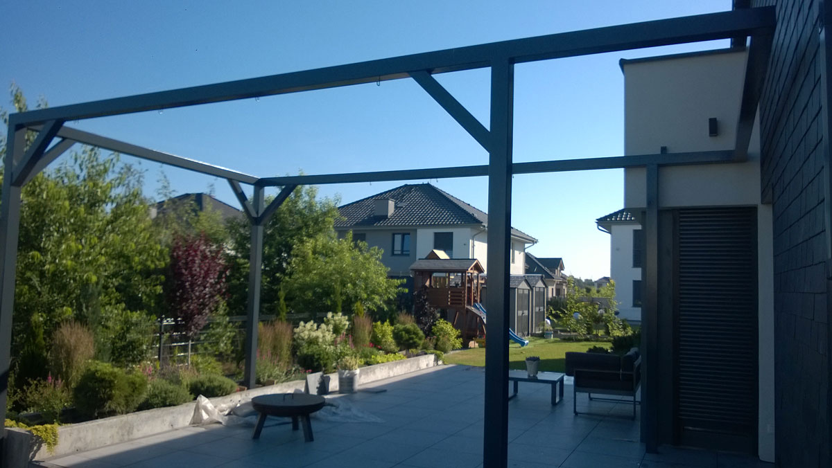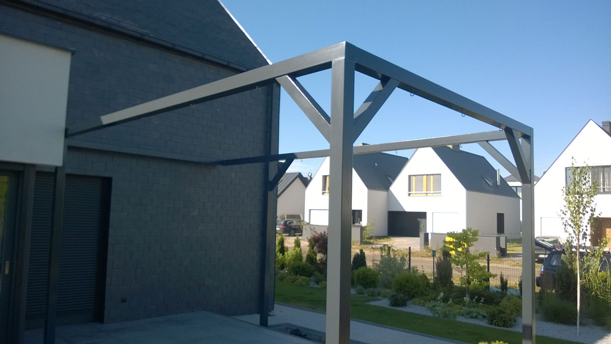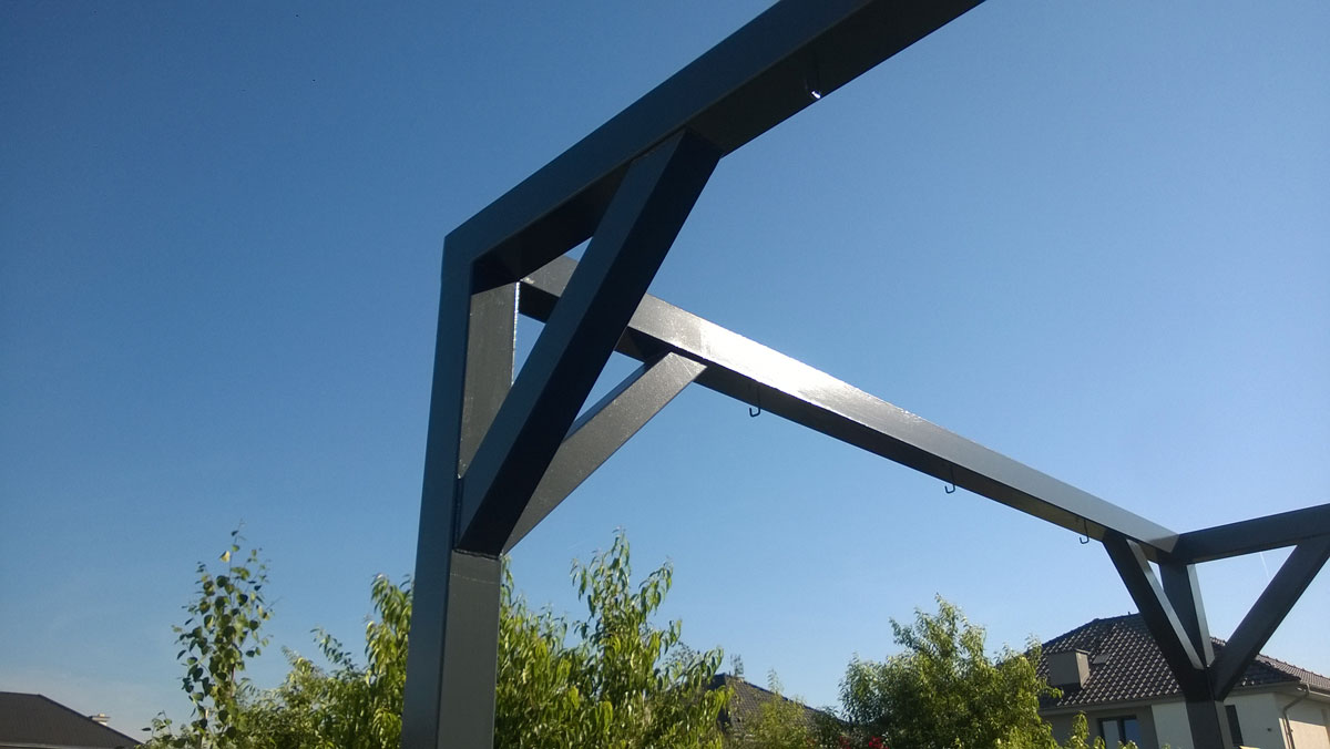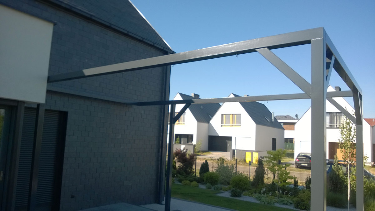 ochroni przed gorącym słońcem w upalne lata, które zdarzają się coraz częściej. Konstrukcję markizy stanowią pospawane solidne profile stalowe o wymiarach 100x100x3mm.