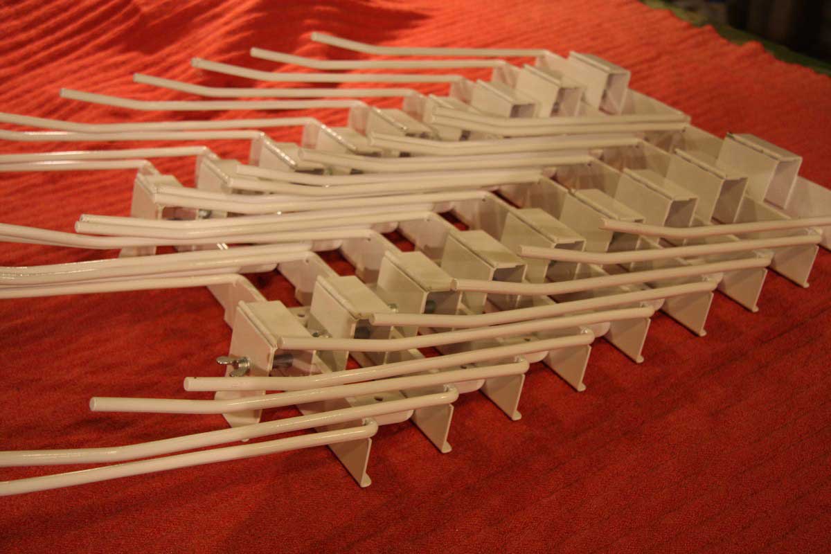 Konstrukcje naszych stojaków na zrywki wykonujemy z kształtowników, prętów oraz blachy. Podzespoły skręcane są śrubami lub spawane. Całość malowana jest proszkowo w dowolnym kolorze RAL. Istnieje możliwość zamontowania do stojaka dociskacza utrudniającego bezwładnościowe rozwijanie się rolki przy szarpnięciu.