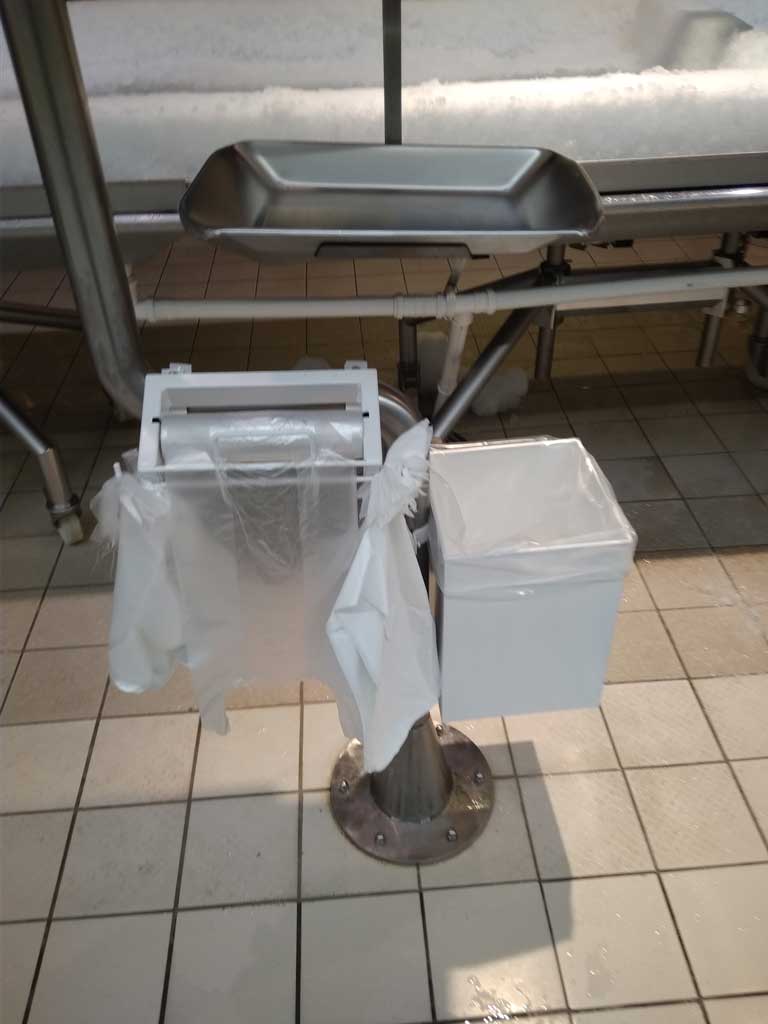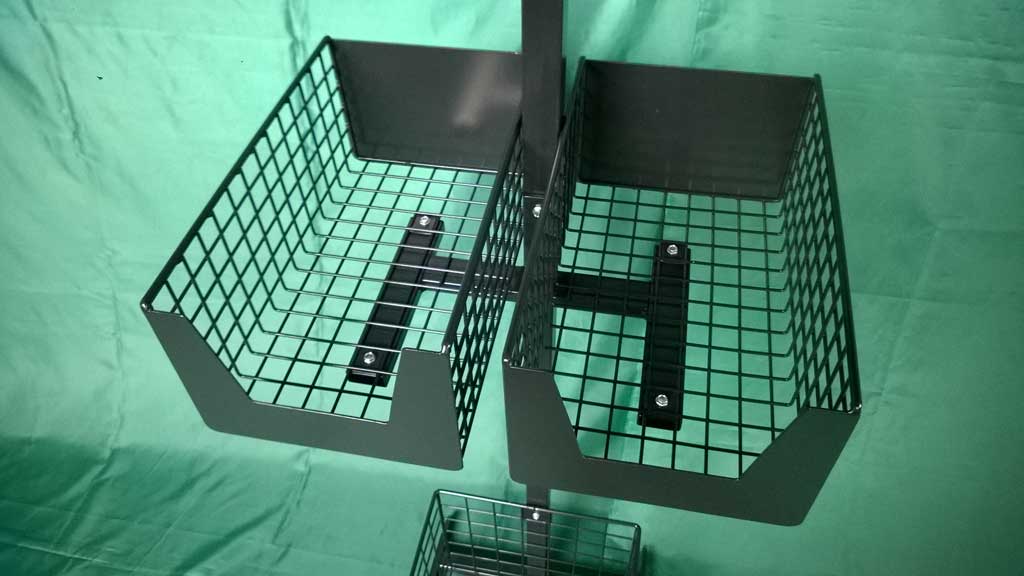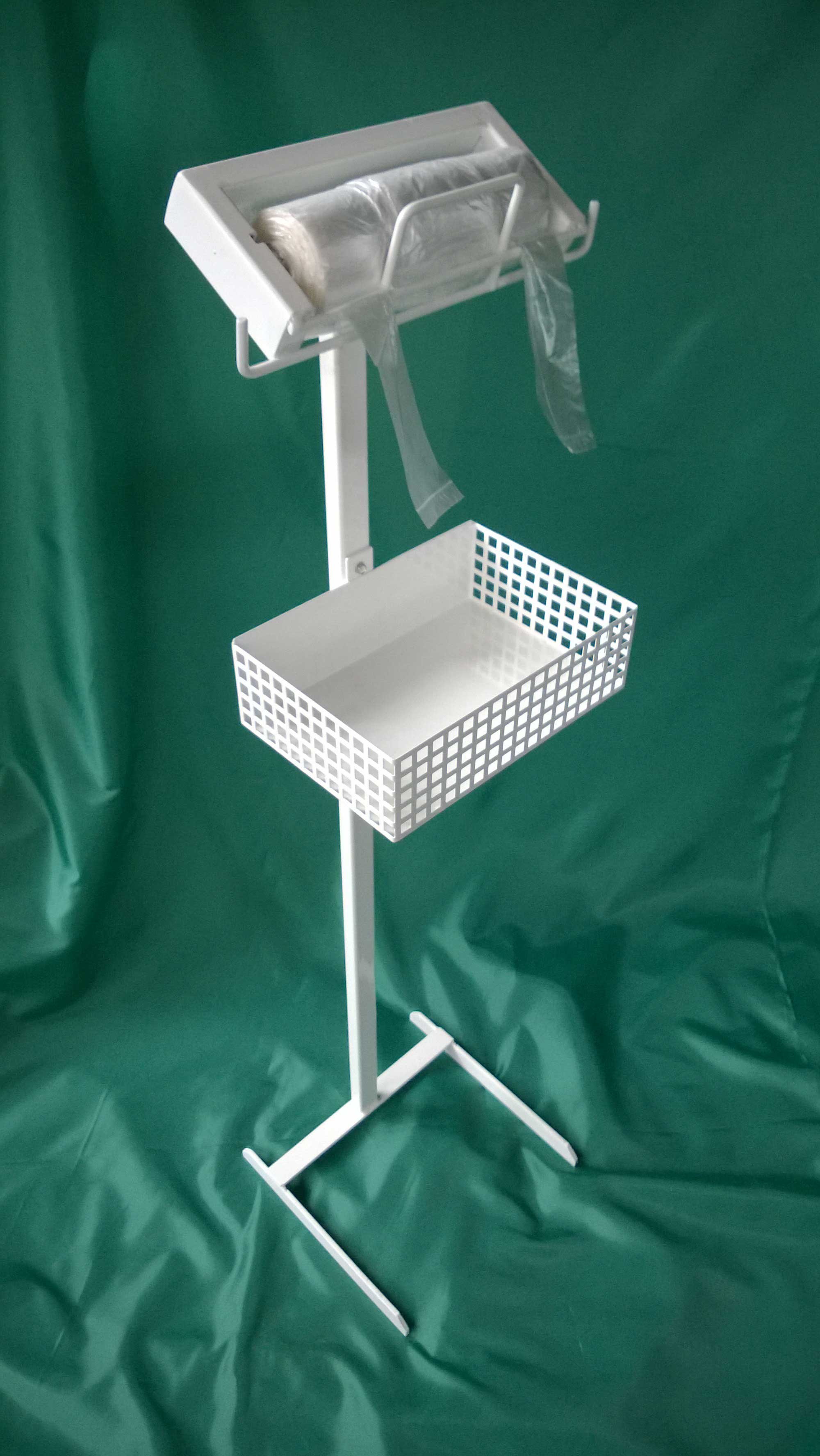 Oferujemy klientom masywne stojaki, zaopatrzone w dwa wieszaki na rolki z woreczkami oraz haki na rękawiczki. Dodatkowo zamontowaliśmy pojemne półeczki na torebki papierowe, tak przydatne w dziale z pieczywem i słodyczami oraz podwójne kosze wspomagające utrzymanie porządku. Stojaki można z łatwością przemieszczać dzięki zamontowanym kółkom.
