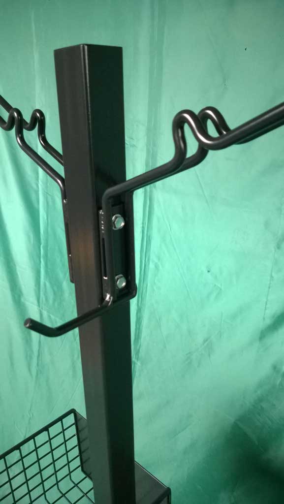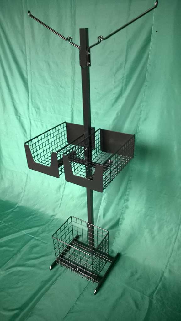 Dodatkowo stojak zaopatrzony jest w dwa haki na rękawiczki, półeczkę na papierowe torebki i estetyczny kosz na śmieci. Natomiast dzięki kółkom meblowym personel sklepu z łatwością może go przestawiać.